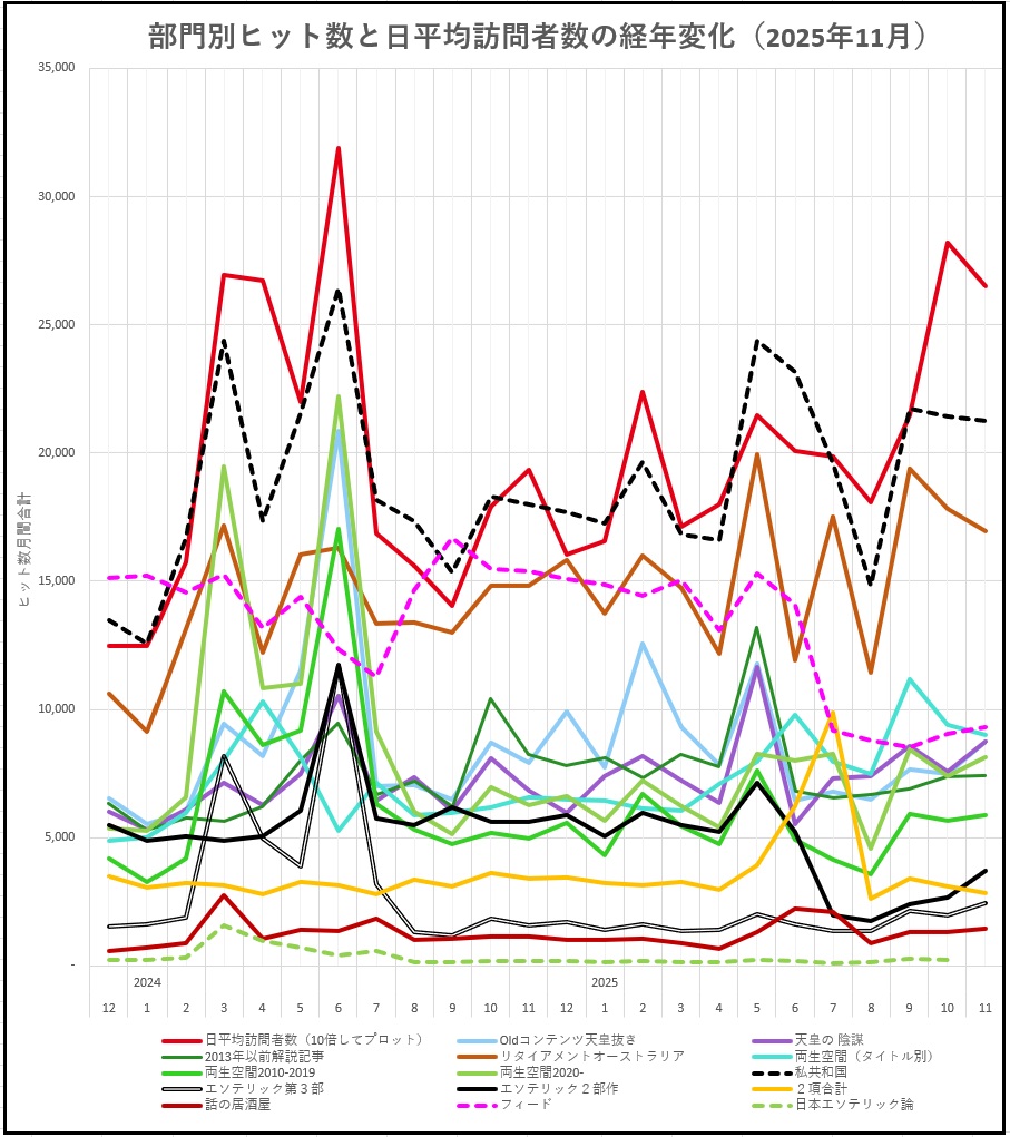 また、中間部に位置する、「フィード」(ピンク点線)、「両生空間(タイトル別)」(コバルト色線)、「Oldコンテンツ天皇抜き」(空色線)〔「天皇の陰謀」(紫線)とほぼ重なって見ずらい〕、「両生空間2020-」(黄緑色線)、「2013以前解説記事」(濃緑色線)、そしてやや下がって「両生空間2010-2019」(緑色線)が一団をなして増加傾向にあります。